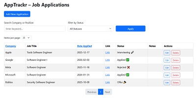 AppTrackr is a local ASP.NET Core MVC application that helps you track job applications, including company, position, status, notes, and job posting links. Data is stored locally using SQLite and Entity Framework Core